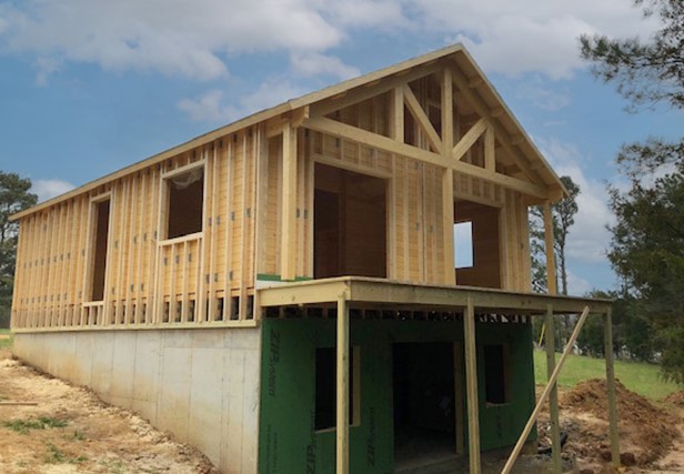 Once the main building kit is assembled—including the exterior walls, interior walls, and roof—the exterior studs and rafters are installed. At this stage, the structure is ready for electrical work.