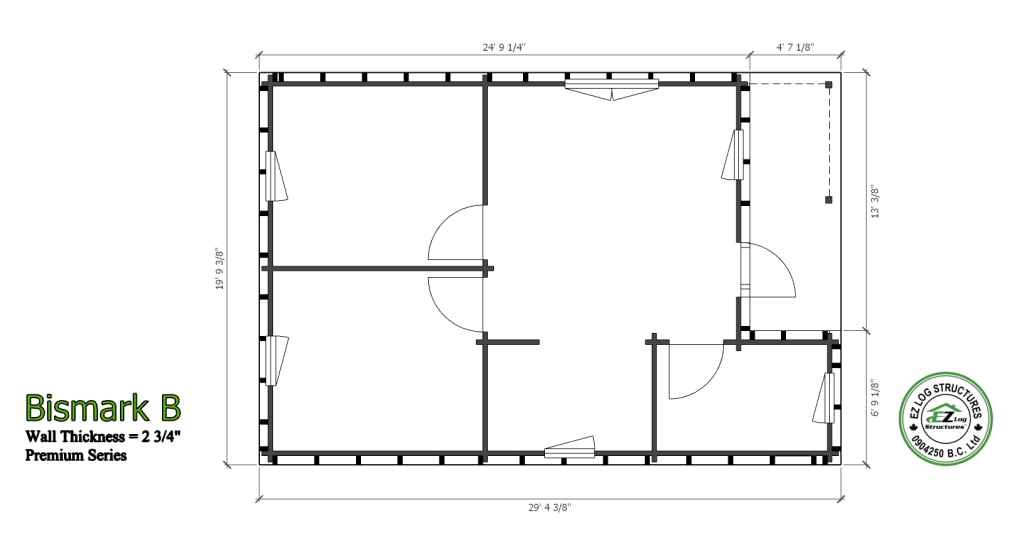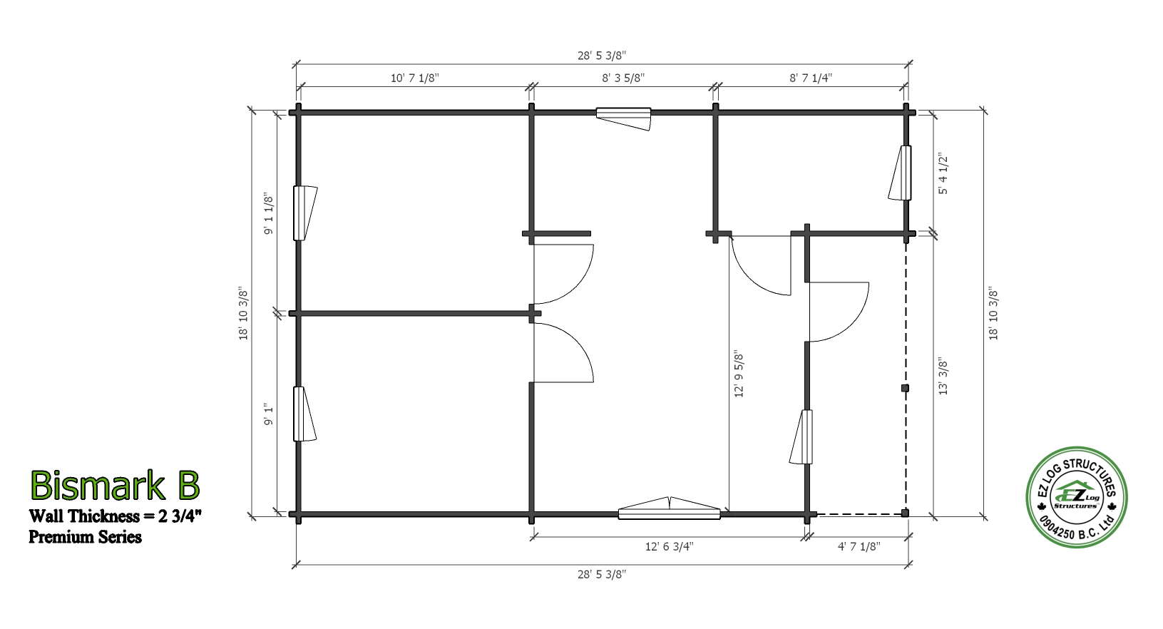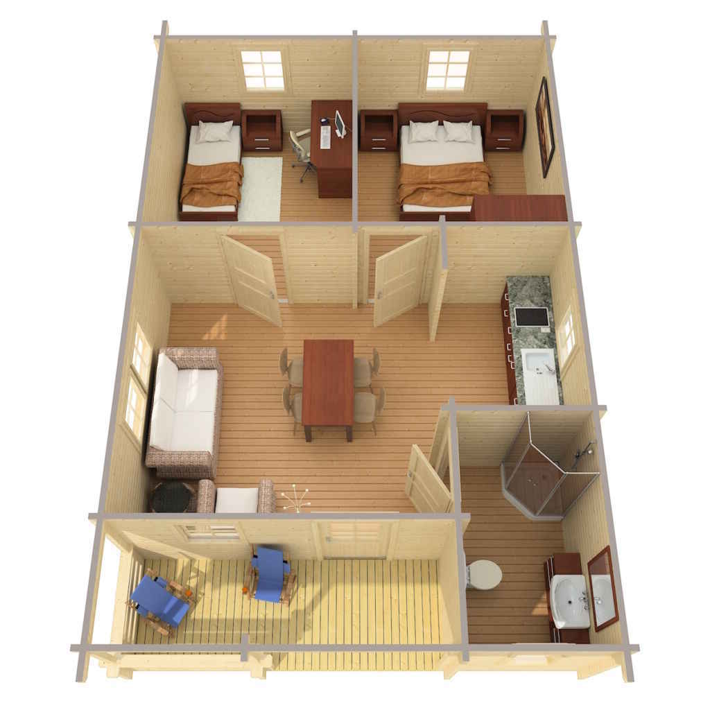 Bismark B kit home or cabin has 70mm (2-3/4″) thick stackable wall logs & includes residential grade, double glazed wood windows & doors. A very affordable 2 bedroom model, ideal for: ADU, additional dwelling unit, granny flat, tiny home or cabin. Can be assembled by 3 people in 3 days