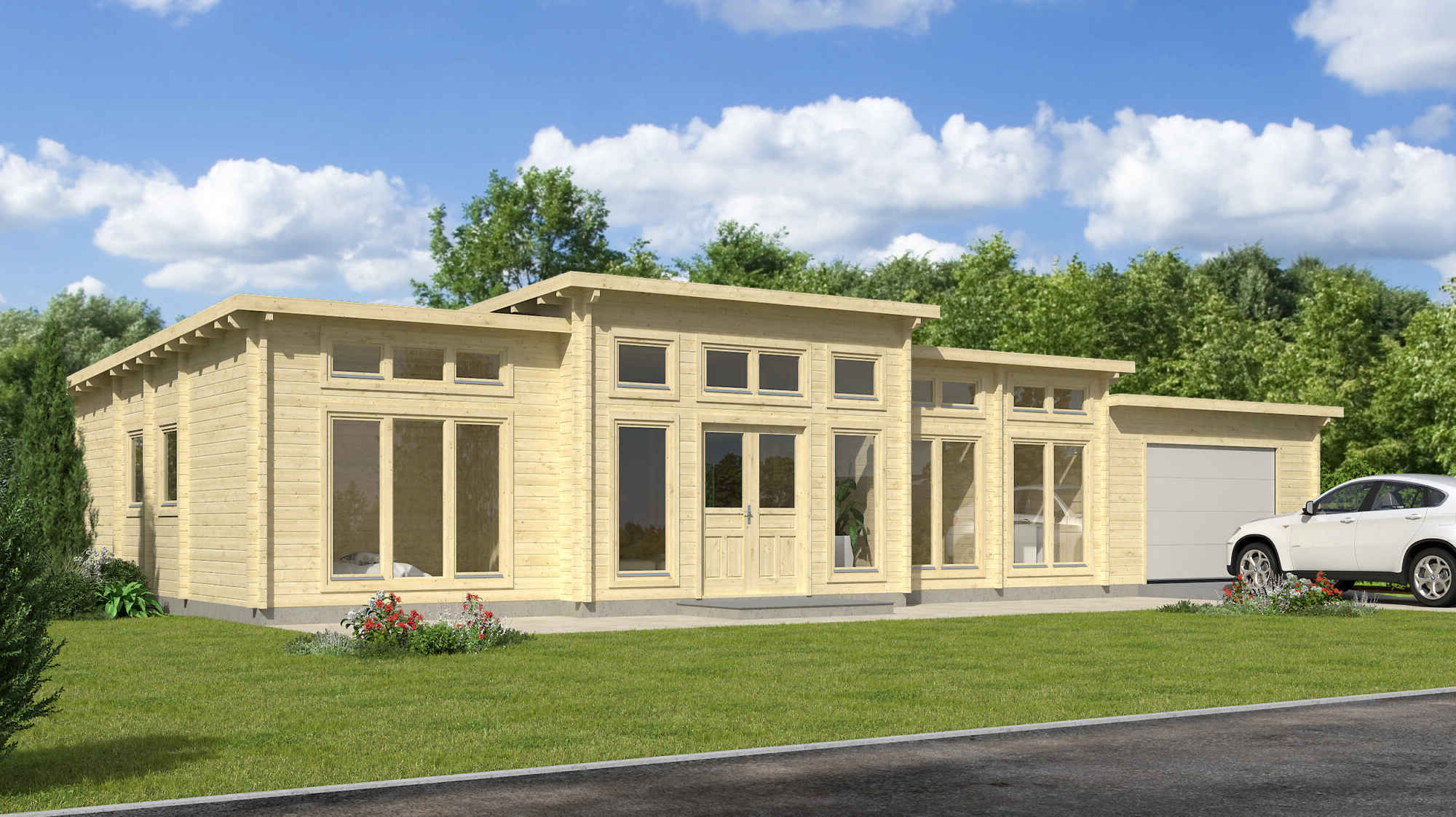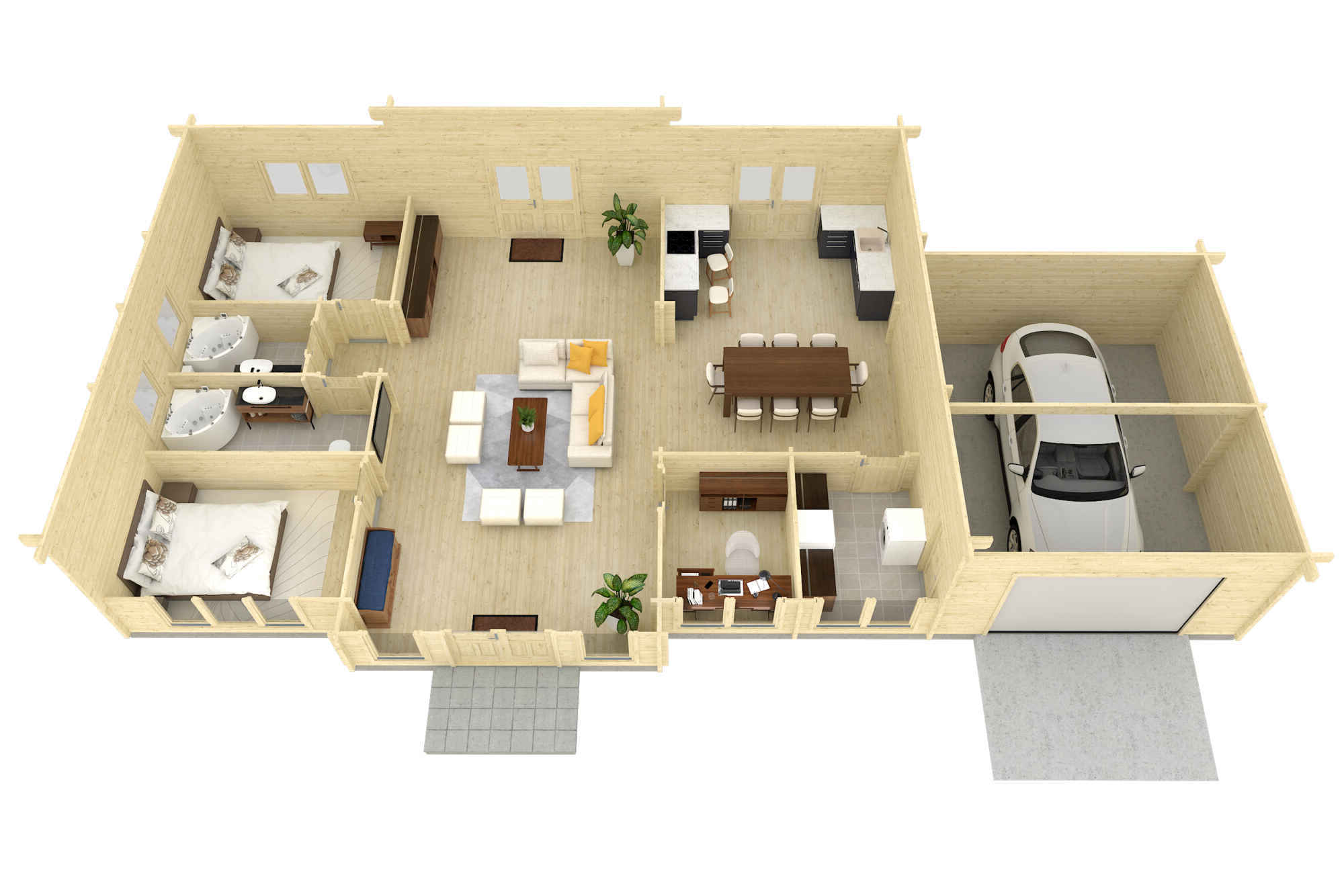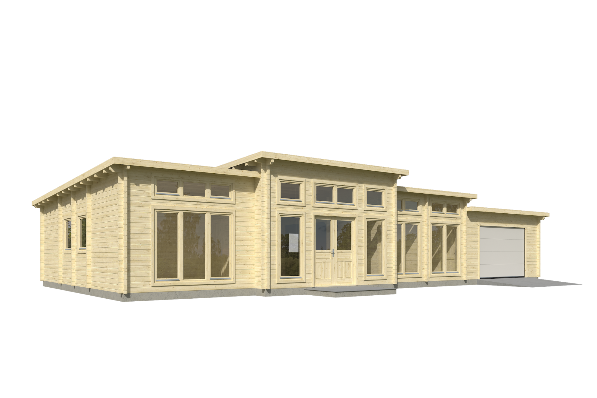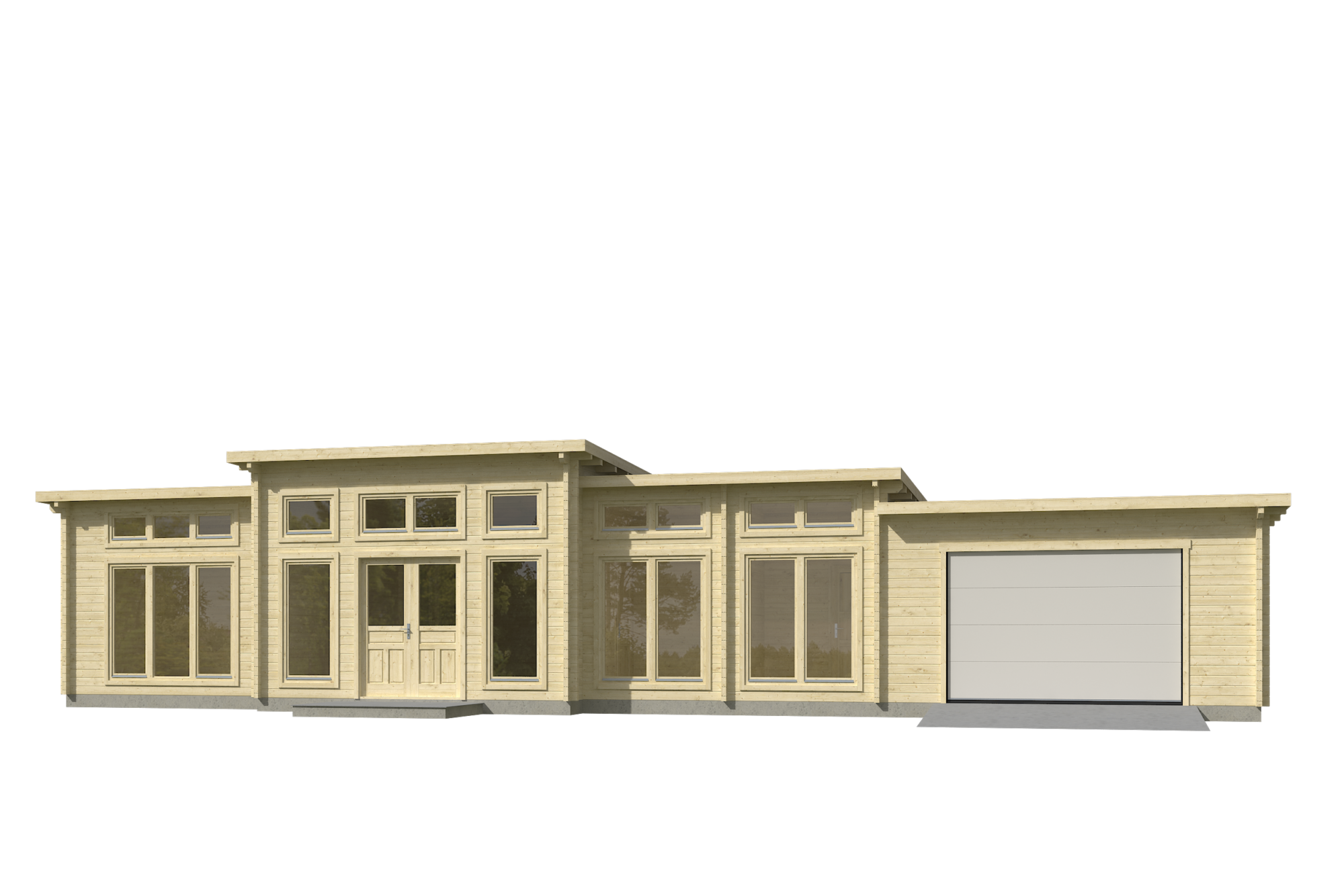 Desert Springs is a contemporary spacious home with just under 1640 sq’ including the garage, can be a 3 or 2 bedroom & 2 bathrooms. The roof line has 3 levels all are vaulted/cathedral ceilings with the center section having 11′ high ceilings at the front and 9’11” high ceilings at the back. The front wall has plenty of windows to let the light in. This kit can be assembled by 3 people in 12 days