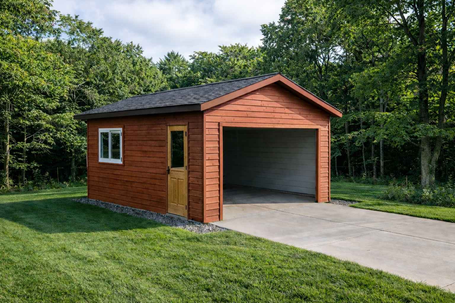 Garage 1420 is a single car garage with solid wood walls using 1-5/8″ x 4-3/8″ (40mm x 113mm) components. Once assembled, studs & siding can be applied to the exterior. We offer 2 types of tongue & groove Pine siding plus an extruded PVC maintenance free siding. The main feature of our garages is the all wood interior with vaulted/cathedral ceilings, ready to hang your tools