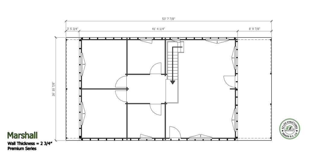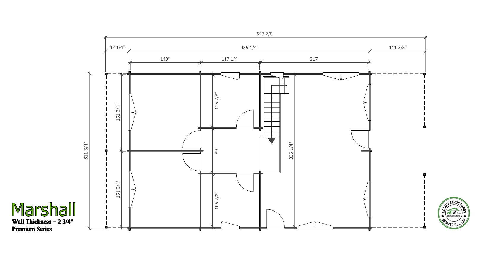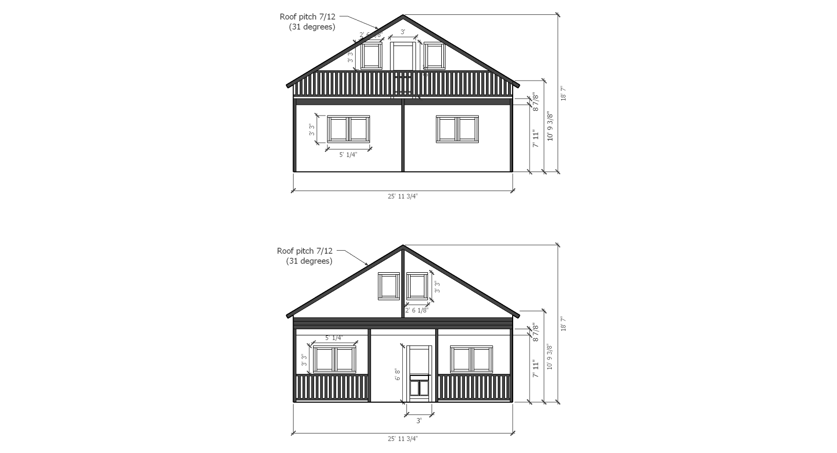 MARSHALL has a footprint of 26′ x 48′  (1248 sq’) on the main floor which includes the covered deck, plus 26′ x 22′ (572 sq’) on the upper level. The upper level includes a 4′ covered balcony on the back wall.  The vaulted ceilings throughout provide a spacious open design. Assembly can be done in 12 days with 3 people