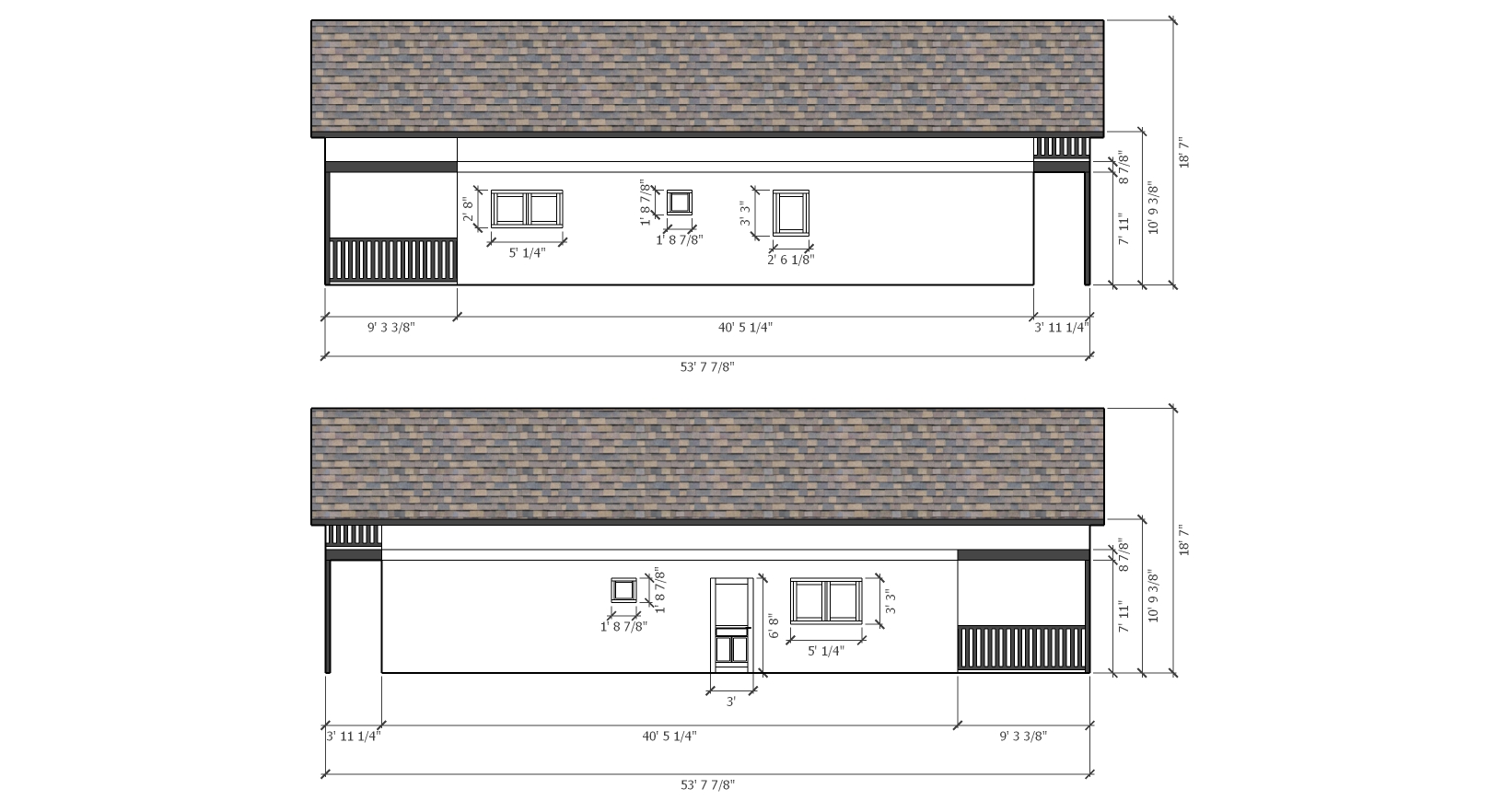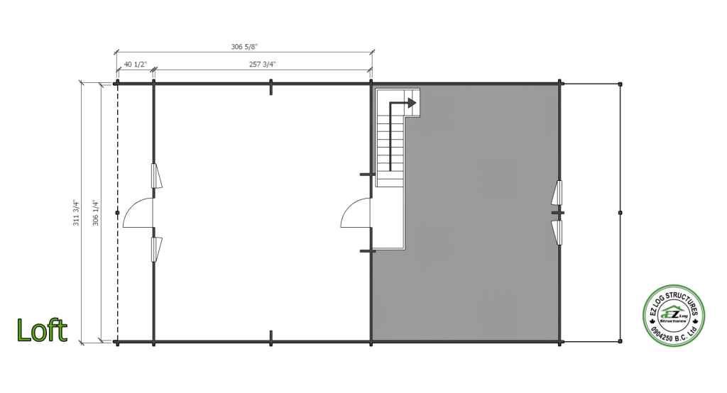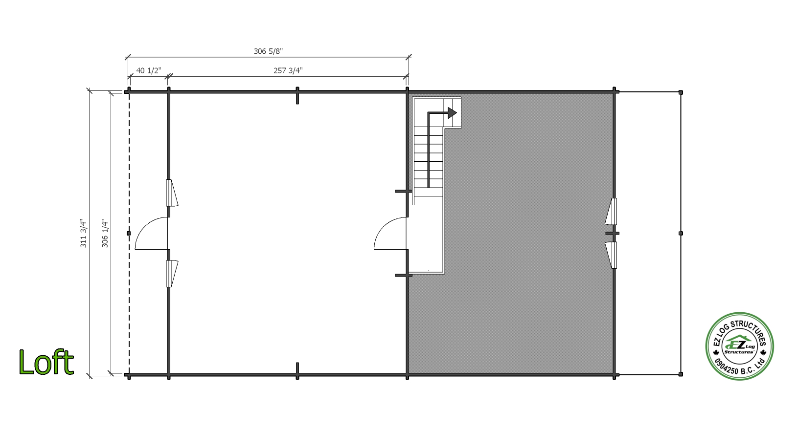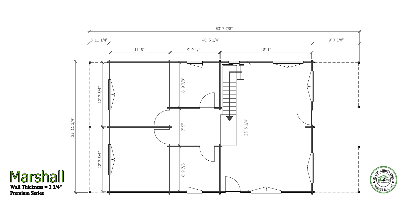 MARSHALL has a footprint of 26′ x 48′  (1248 sq’) on the main floor which includes the covered deck, plus 26′ x 22′ (572 sq’) on the upper level. The upper level includes a 4′ covered balcony on the back wall.  The vaulted ceilings throughout provide a spacious open design. Assembly can be done in 12 days with 3 people