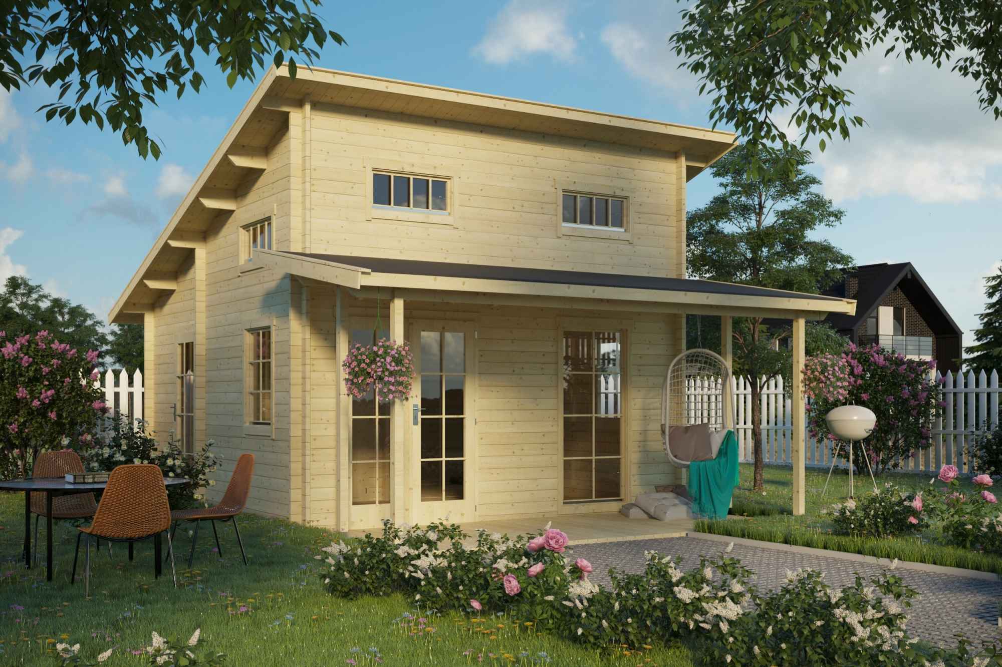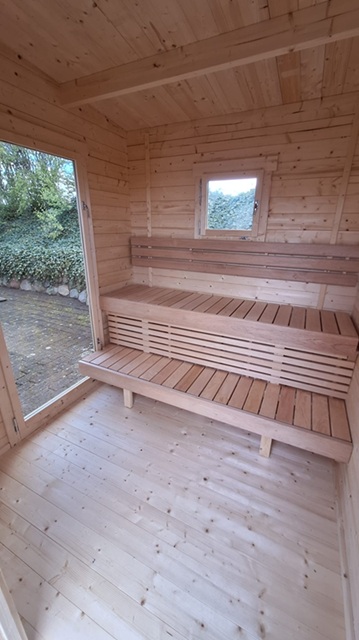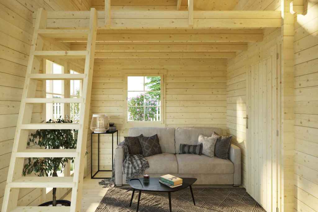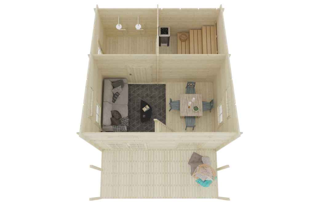 Sauna Cabin A offers options related to comfort. The interior space can be divided into a steaming room, a cooling room, or a lounge area. Additionally, a cozy low loft nook completes the structure as a whole. The front sloped roof extends the exterior space, with the large roof overhang providing extra outdoor area, while roof windows allow for better natural light flow into the interior.