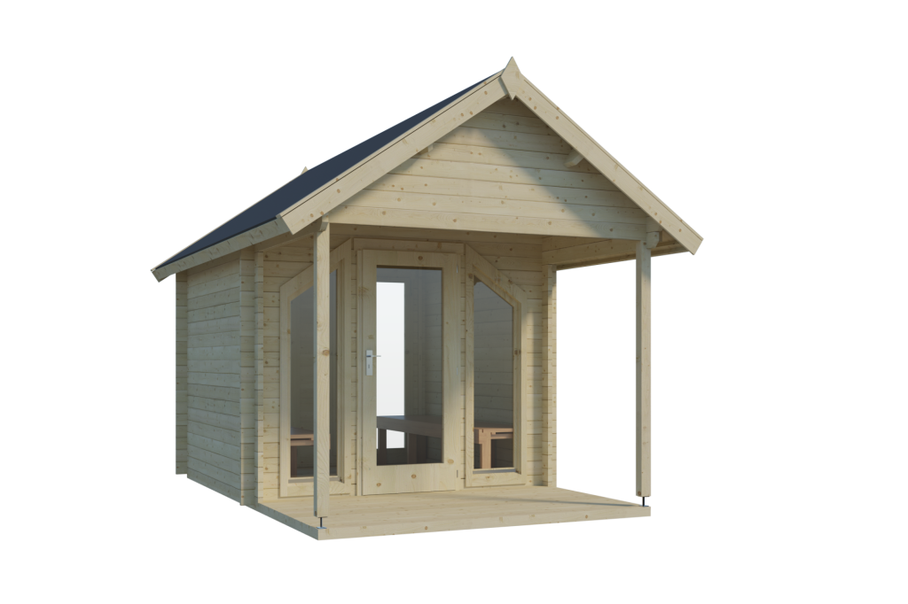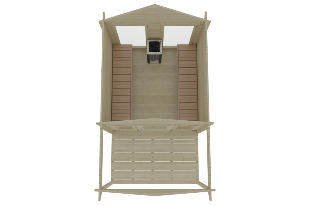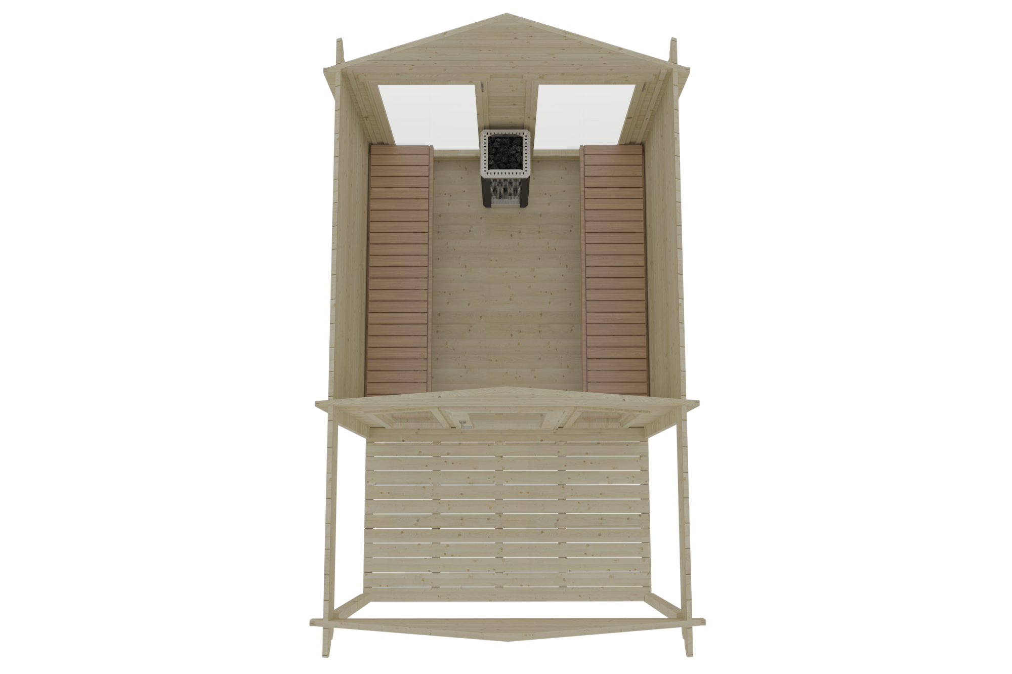 Sauna Dockside A offers an interior space of approximately 67 sq ft, complemented by a covered front deck that creates an additional area for relaxation. The vaulted ceiling enhances the circulation of warm air, improving comfort inside the sauna.