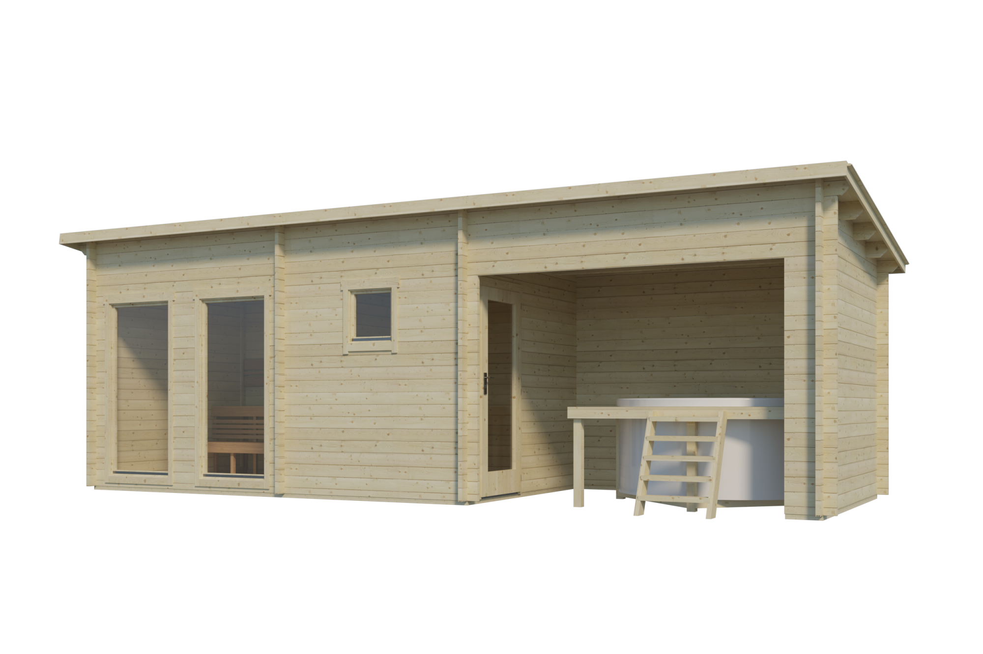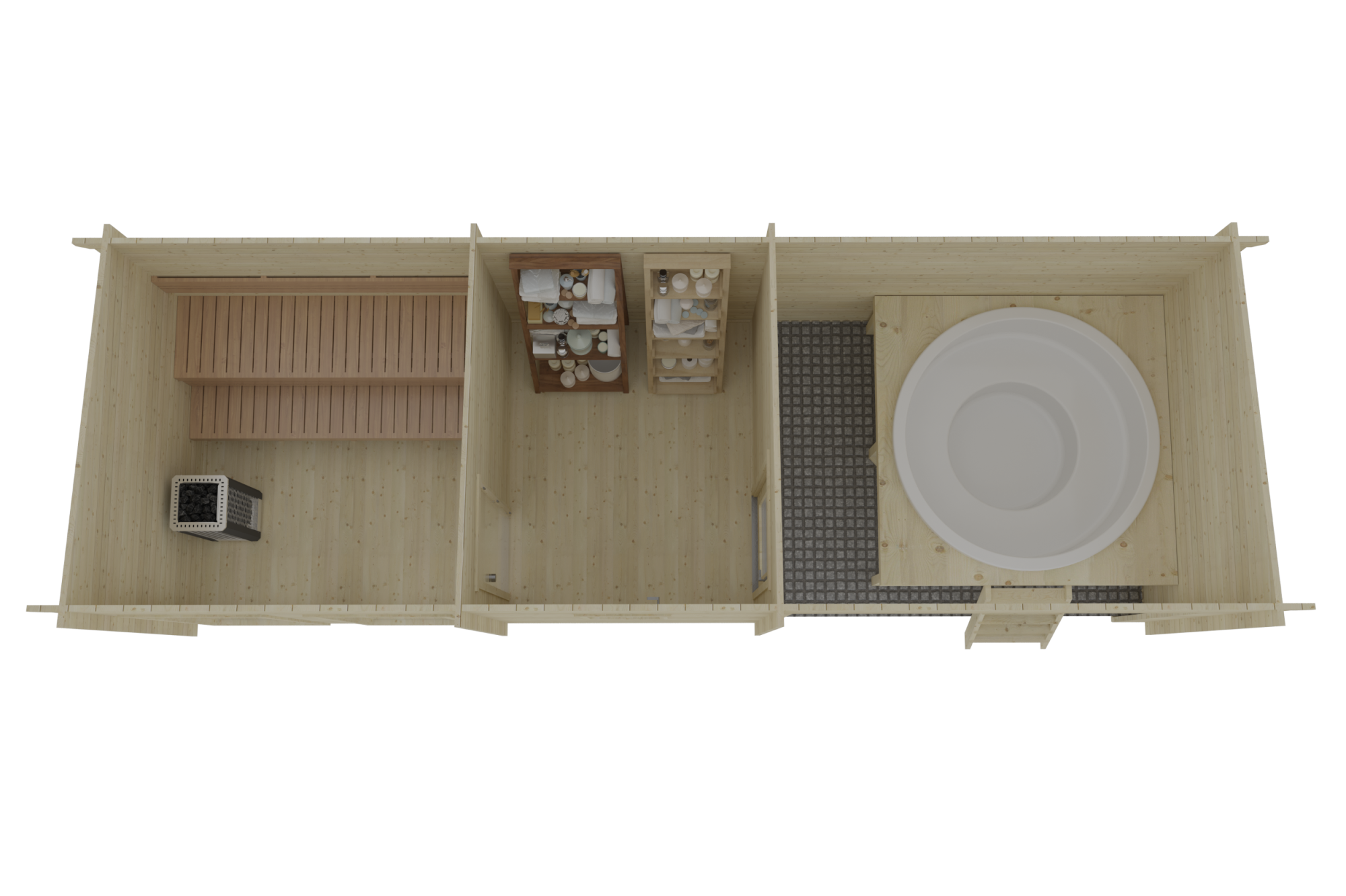 Sauna Flat C is a refined structure with 1-5/8″ thick walls, ensuring a durable, integrated build. The layout includes a covered nook, ready to be adapted as needed. The cooling area leads into the sauna room. The sauna room features tall windows designed to provide outdoor visibility.