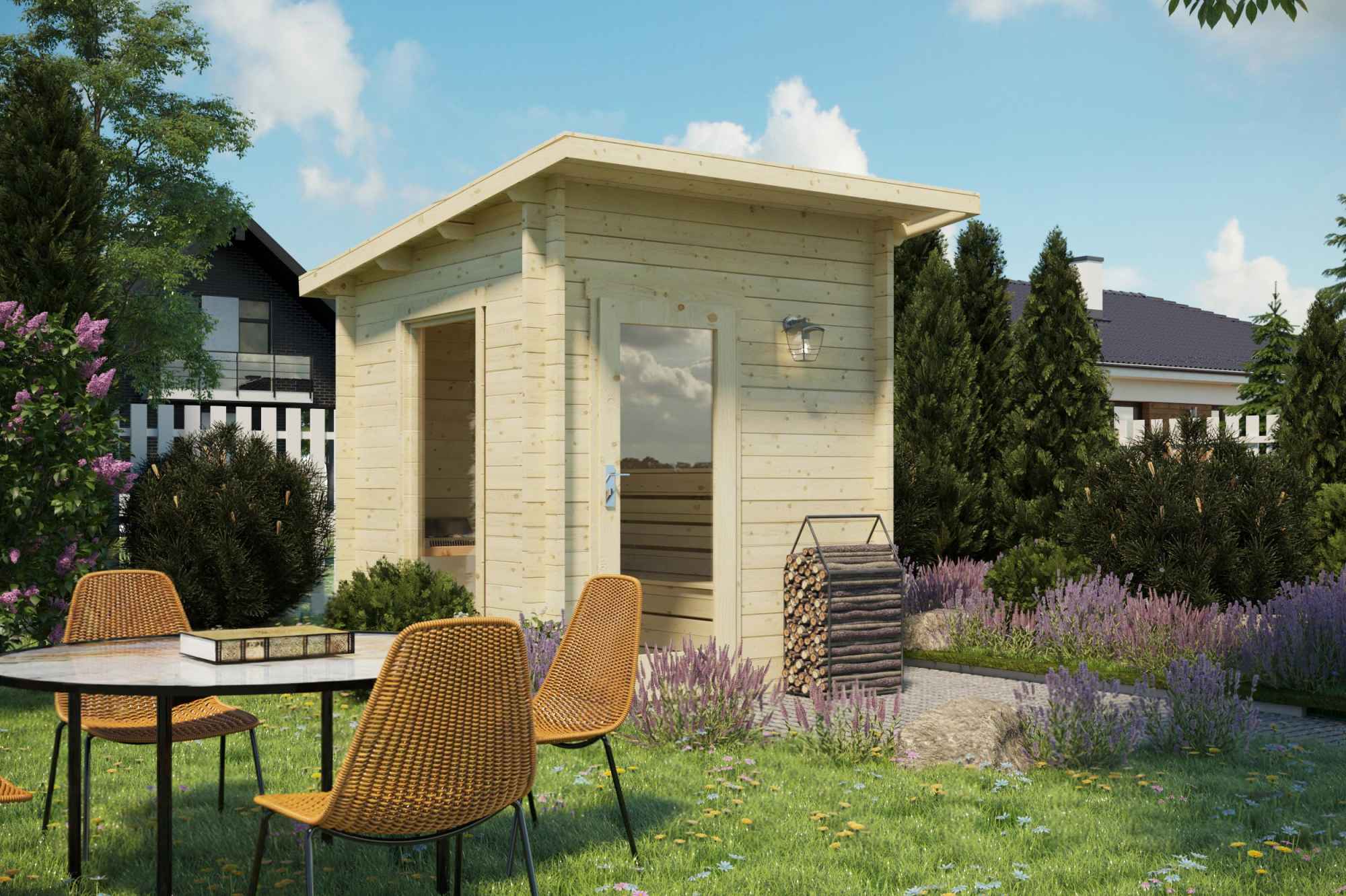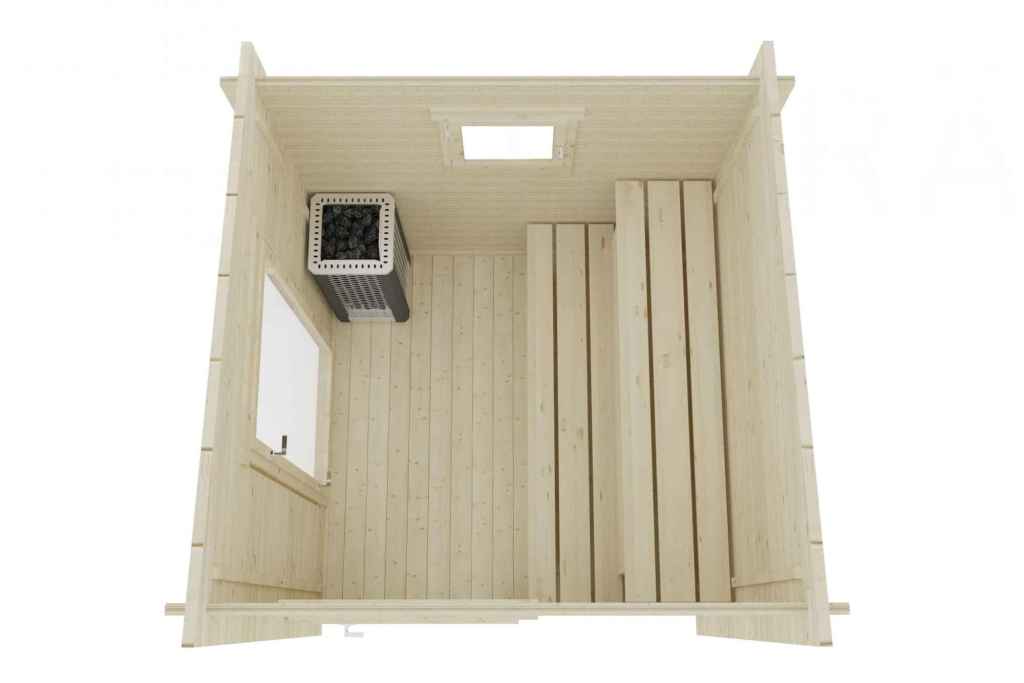 Sauna Garden – this compact sauna offers a cozy, single-room design perfect for personal relaxation. An insulated ceiling contributes to improved comfort and helps retain the heat. The door features full tempered glass, providing optimal natural light transmission. Tilt-only opening windows enhance ventilation control.