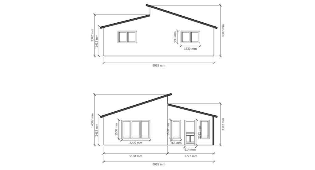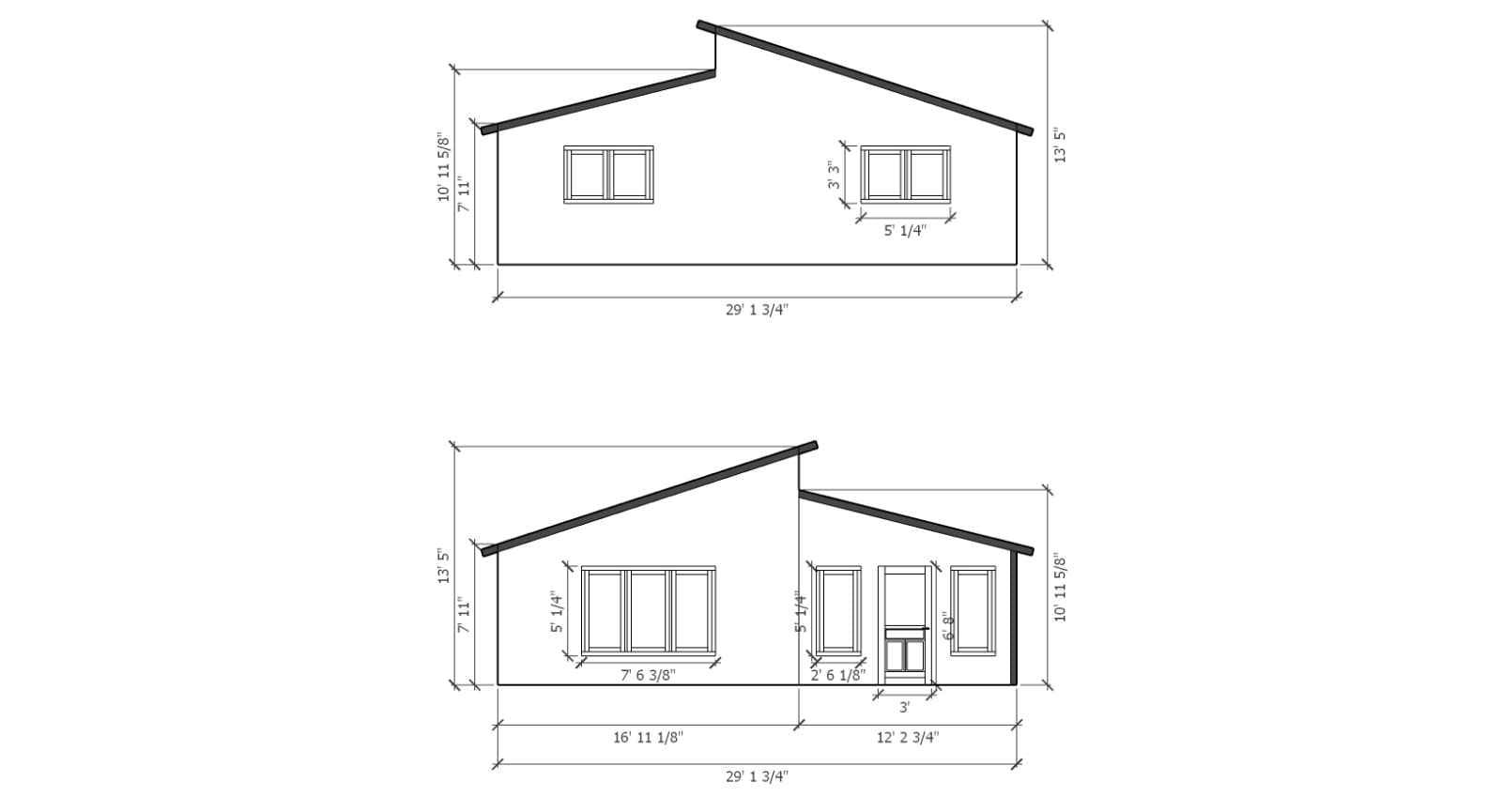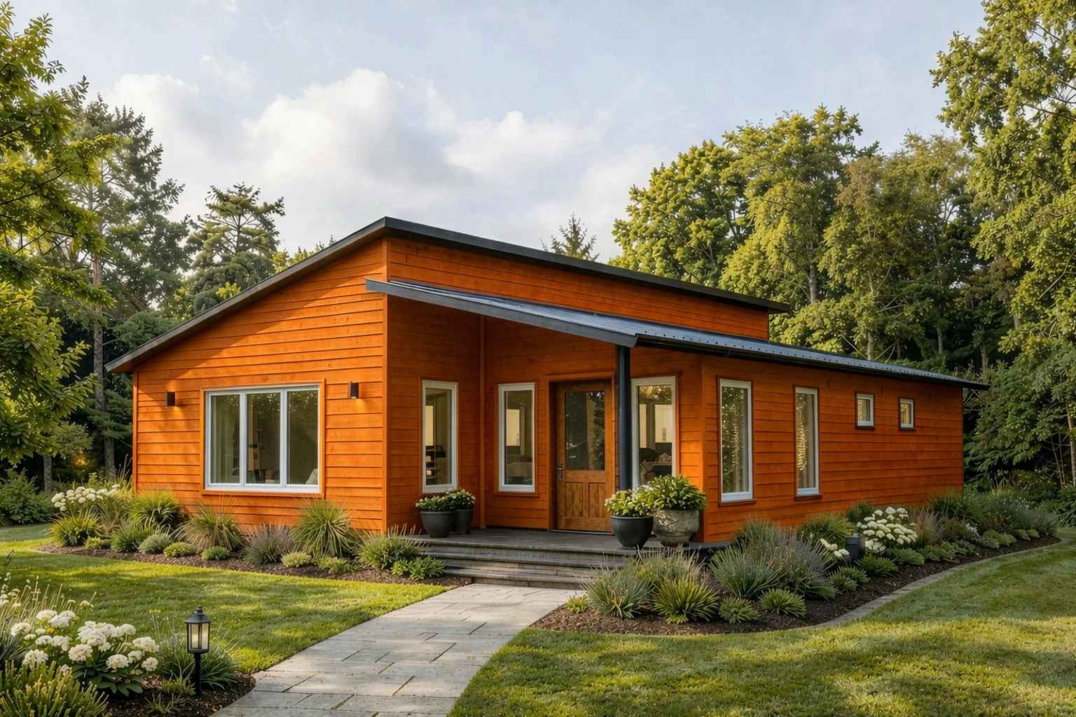 Thompson is NEW model for 2026 and is a stylish 1362 sq’ home with 3 bedrooms, 2 bathrooms. This design has a two level flat sloped roof with vaulted/cathedral ceilings. Can be assembled by 3 people in 8 days